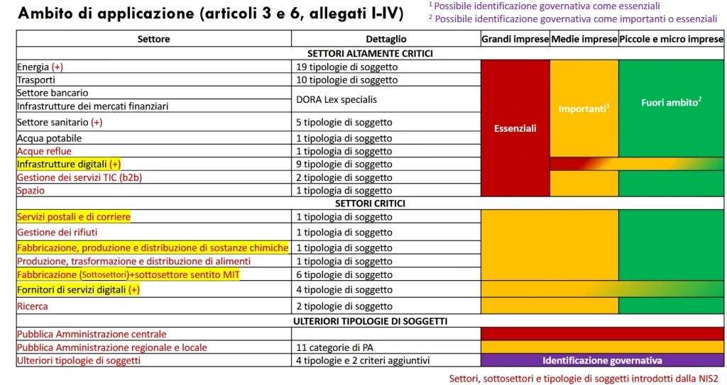 - Settori essenziali (Allegato I): energia, trasporti, banche, infrastrutture finanziarie, sanità, acqua potabile, acque reflue, infrastrutture digitali, pubblica amministrazione